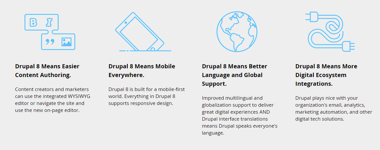 Drupal 8 has something for everyone who supports online content and digital experience at your organization: business decision makers, site administrators, digital marketers, content managers, web developers, technical architects, and IT pros.